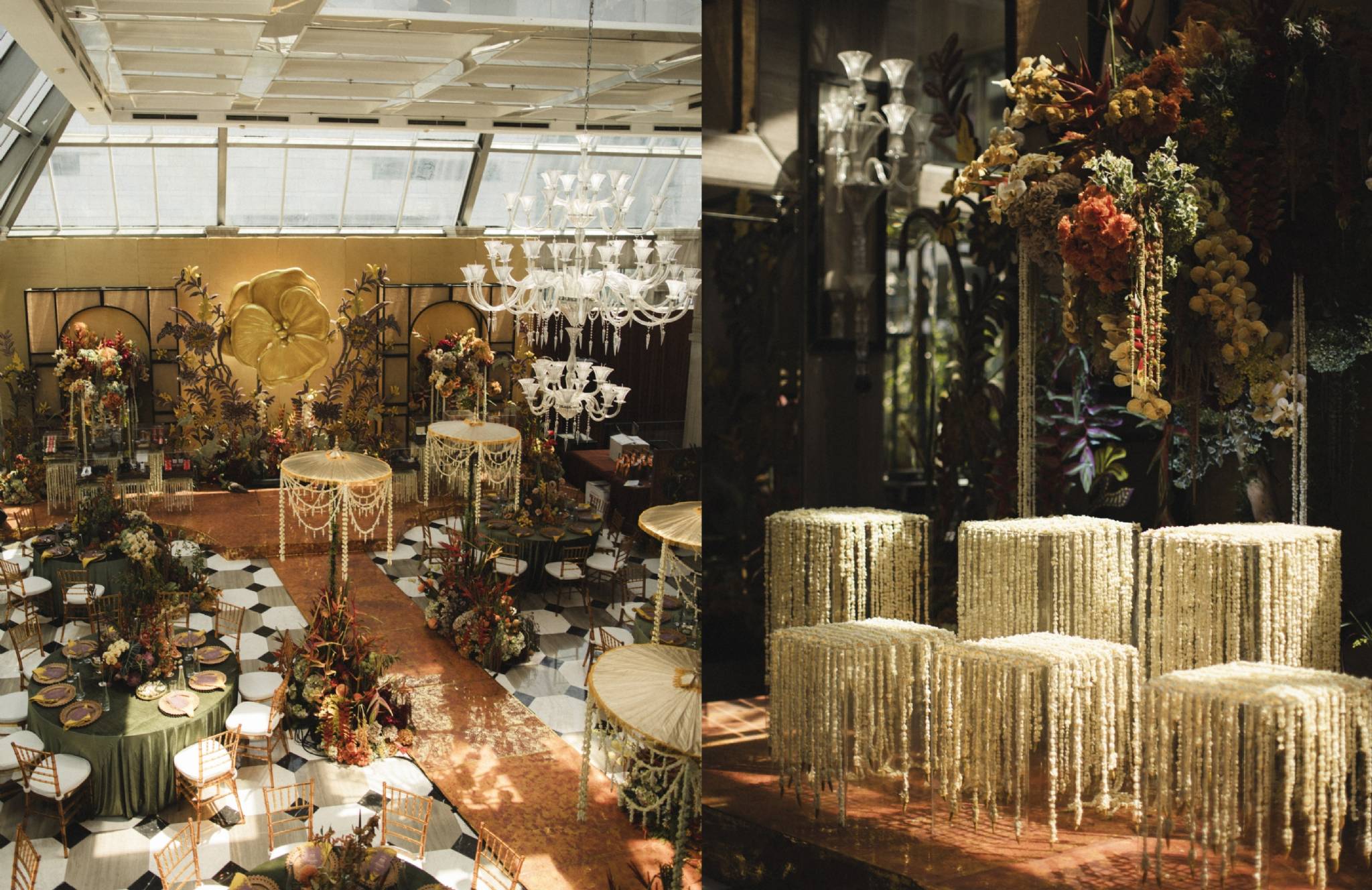 Dekor kini bukan hanya meja & bunga, tapi instalasi hanging, drapery kain yang terjalin indah, bahkan sampai tanaman gantung. Hasilnya: suasana yang terasa dinamis dan berbeda dari dekor biasa.