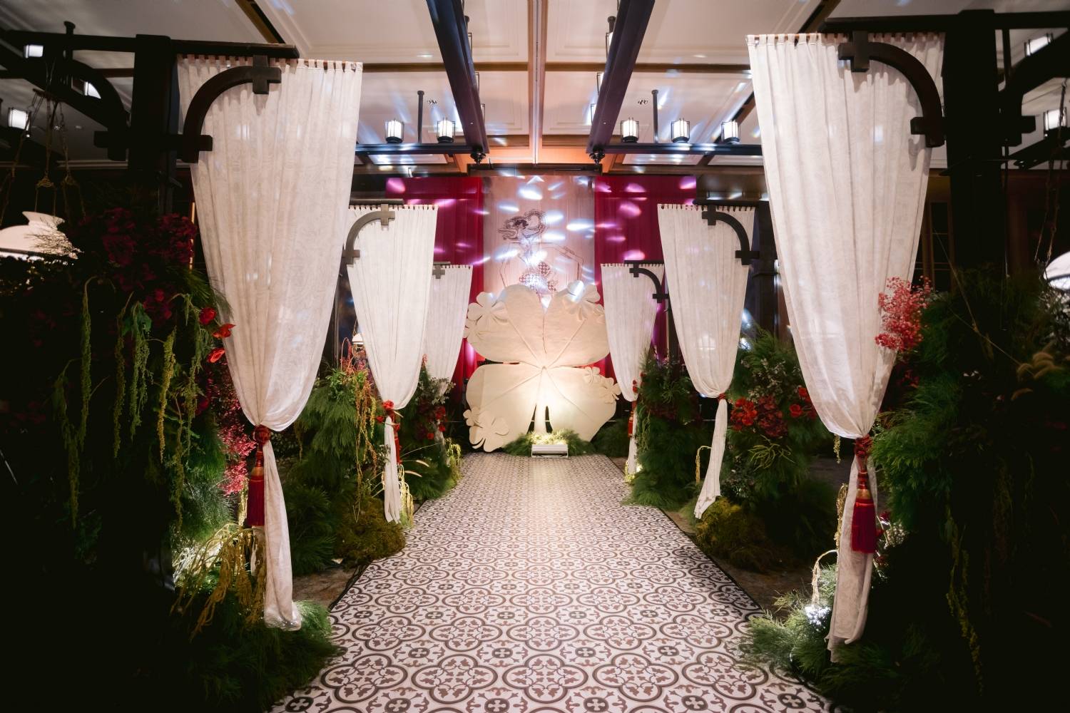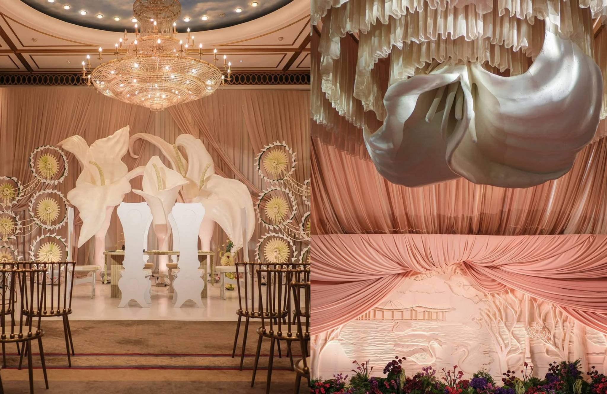 Di venue indoor atau outdoor di Indonesia, kamu bisa berdiskusi dengan vendor untuk instalasi gantung atau tenda dengan kain transparan yang menggantung sebagai bagian dekor.